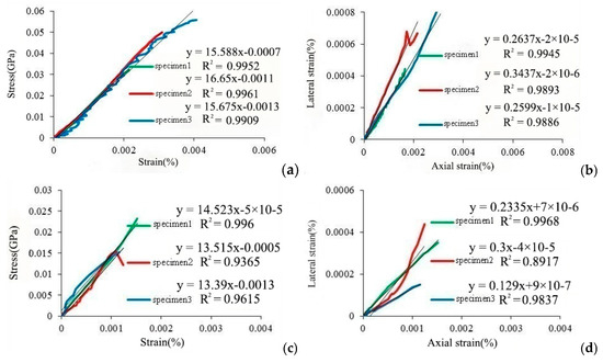 Test results for elastic modulus and Poisson’s ratio of specimens: (a) Elastic modulus test results of concrete specimens; (b) Poisson’s ratio test results of concrete specimens; (c) Elastic modulus test results of surrounding rock specimens; (d) Poisson’s ratio test results of surrounding rock specimens.
