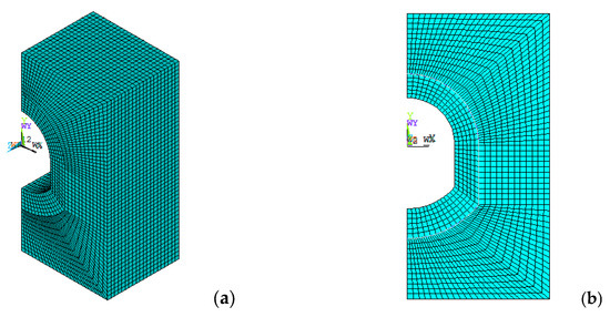 The stiffer surface is selected as the target surface. Based on the above configurations, both plane and 3D finite element models are established. In the 2D finite element model, quadrilateral elements PLANE82 are used for meshing, while in the 3D finite element model, hexahedral elements SOLID45 are employed for meshing. Both plane and three-dimensional models were established, as shown in Figure 13.