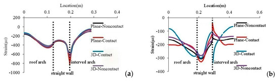 Two types of models, planar and three-dimensional, were established as shown in Figure 14. The contact model establishes mechanical interaction between the shaft lining and surrounding rock, whereas the non-contact model omits such interface behavior. The fundamental distinction lies in whether to consider the rock-lining interaction-neglecting this effect may lead to significant deviations from actual field conditions. As shown in Figure 14a, except for the invert and sidewall areas where the plane model strain exceeds that of the 3D non-contact model, strains in other locations are nearly identical between the 3D and plane models. Due to reduced stress concentration in contact models, the 3D contact model exhibits the smallest strain. Figure 14b shows that at the crown, strains decrease in the following order: 3D contact model, 3D non-contact model, plane non-contact model, and plane contact model. At the invert, the strain trend of the 3D contact model is completely opposite to the other three models.