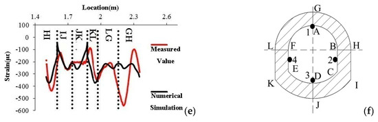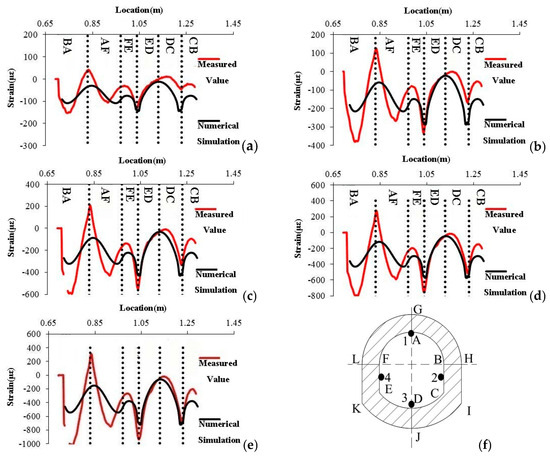 Comparison between fiber optic measurements and numerical simulations at the inner edge of the NO. 3 shaft lining model: (a) X = 0.48 MPa, Y = 0.8 MPa; (b) X = 0.96 MPa, Y = 0.1.6 MPa; (c) X = 1.44 MPa, Y = 2.4 MPa; (d) X = 1.92 MPa, Y = 3.2 MPa; (e) X = 2.4 MPa, Y = 4 MPa; (f) Specific point numbering of the shaft lining model.