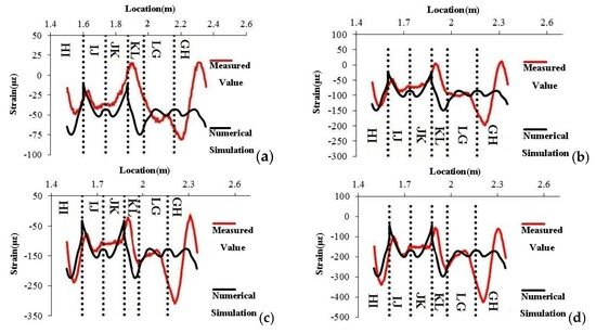 As shown in Figure 16, fiber optic measurements at the outer edge of the shaft lining generally align with theoretical predictions. Minor deviations at certain points may result from errors in dimensions, installation, or other factors. The large compressive strain at point G, which contradicts numerical simulation results, is likely caused by dimensional differences, casting issues, or gaps between the surrounding rock and loading plates. Except for point G, most fiber optic measurements closely match numerical simulation results. This confirms that fiber optics can effectively monitor strain across the entire outer edge of the shaft lining.