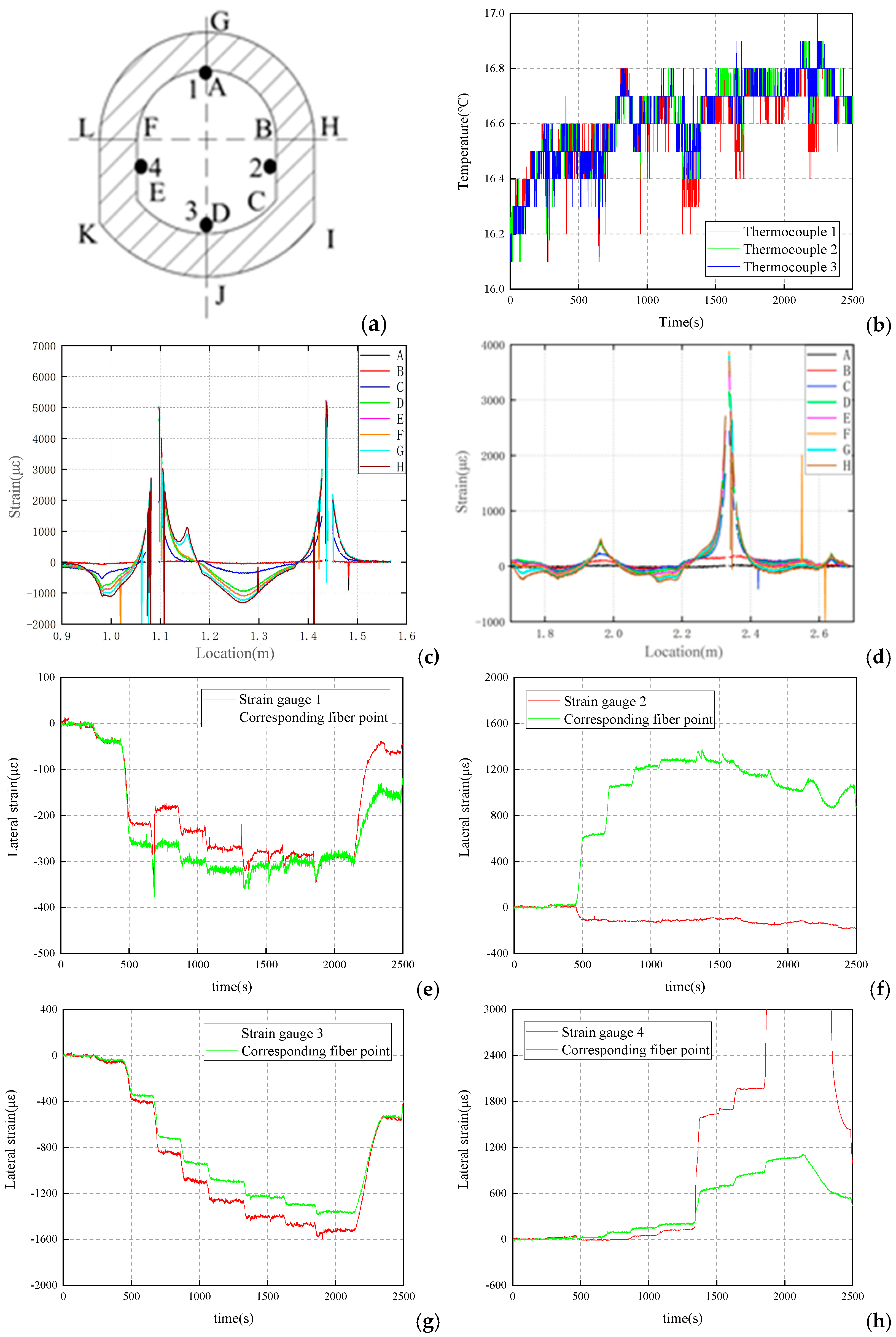 Detailed results of the No. 2 shaft lining loading test are shown in Figure 9, including temperature changes, fiber optic strain monitoring, and comparisons between fiber optics and strain gauges. According to Figure 9b, the temperature variation remained within 1 °C throughout the test, ensuring reliable strain measurements. Figure 9c demonstrates that the fiber optics fully monitored strain changes at the inner edge of the shaft lining. Larger compressive strains were observed at points E and C, and the EF segment showed a tendency for cracking, although no actual cracks were observed. This indicates that fiber optics can detect minor deformations before cracks become visible. In the strain monitoring of the outer edge, Figure 9d shows that the fiber optics effectively monitored the entire cross-section. No significant tensile strain zones were observed, consistent with the stress distribution during loading.