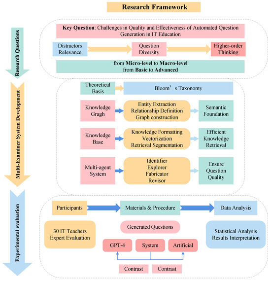 This study utilized a mixed-methods approach combining system development and experimental validation to improve the quality of automatically generated MCQs in IT education. The research framework, shown in Figure 1, consisted of three phases: system development, experimental evaluation, and data analysis, progressively addressing research questions from foundational elements to advanced cognitive objectives. The study’s research questions covered distractor quality, question diversity, and higher-order thinking skills, creating a structured pathway from micro-level elements to comprehensive cognitive assessment.