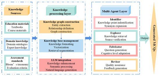 Inspired by the successful application of LLMs in test question generation [26,27], the generative core of our Multi-Examiner system consists of LLMs and intelligent agents, enabling sophisticated natural language question formulation. However, they often lack the necessary domain-specific knowledge and may produce homogeneous questions, resulting in insufficient diversity and weak relevance among distractors. This section examines how these technologies have evolved and identifies these challenges as opportunities for improvement that our system addresses.