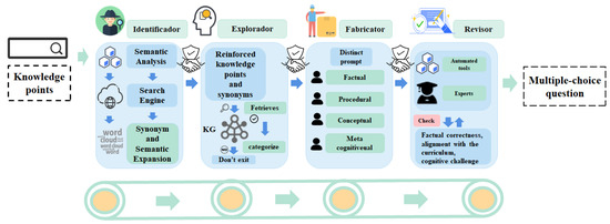 where represents the question generated, t is the type of knowledge (factual, conceptual, procedural, metacognitive), k is the knowledge point, and is the tailored prompt for type t. The Fabricator’s innovation is reflected in its ability to dynamically adjust question complexity according to learning objectives. This agent adopts specific generation strategies () for different cognitive objectives (t), ensuring assessment validity while controlling question cognitive load levels. The Fabricator’s innovation is reflected in its ability to dynamically adjust question complexity according to learning objectives. For example, when generating conceptual understanding questions, the system controls information quantity and problem context complexity to ensure optimal cognitive load levels.