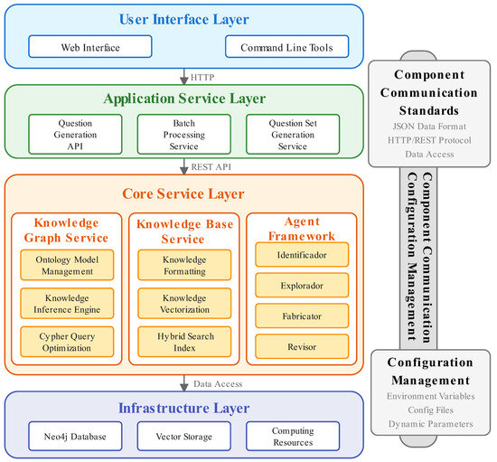 As shown in Figure 4, the Multi-Examiner system features a four-layer architectural design that integrates the knowledge graph and question generation modules. The User Interface Layer serves as the entry point for processing question generation requests through the Application Service Layer. The Core Service Layer contains the system’s essential intelligent components: the Knowledge Graph Service, which provides Ontology Model Management, the Knowledge Inference Engine, and Cypher Query Optimization; the Knowledge Base Service, which manages Knowledge Formatting, Knowledge Vectorization, and Hybrid Search Index construction; and the Agent Framework, based on the Langchain framework, which comprises Identificador, Explorador, Fabricator, and Revisor, collaborating in knowledge identification, exploration, construction, and validation. The Infrastructure Layer includes the Neo4j Database and Vector Storage, forming a complete knowledge-driven question generation system through standardized component communication and configuration management. Furthermore, the system creates query tools for both the Identificador and Explorador, employs prompt engineering strategies for agents to perform their respective roles, and implements an event bus based on the publish–subscribe pattern for asynchronous communication.