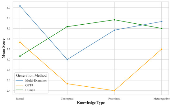 Based on the above analysis, we conclude that Multi-Examiner demonstrates a significant advantage in generating contextually relevant distractors, especially for factual and procedural knowledge types. The effectiveness of Multi-Examiner suggests that leveraging structured domain-specific information enhances the generation of distractors, achieving a quality level comparable to that of human-generated questions across multiple knowledge types. The higher scores observed for conceptual and metacognitive knowledge types indicate that these areas may be less challenging for automated systems, likely due to the more flexible nature of the knowledge involved, which allows for more variance in distractor generation.
