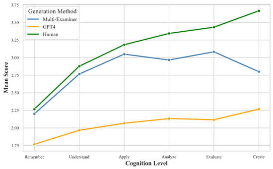 From Figure 8, we can observe the following trends: (1) Multi-Examiner significantly outperforms GPT-4 in higher-order thinking skills (particularly in the evaluation and creation levels) and is close to the level of human-generated questions. (2) GPT-4 performs well in lower-order thinking skills (memory, understanding) but shows a marked decline in higher-order thinking skills. (3) Human-generated questions exhibit the most stable performance across all cognitive levels, especially maintaining a high level in higher-order thinking skills. (4) The performance gap between Multi-Examiner and human-generated questions is small in the evaluation and creation levels, indicating that Multi-Examiner has good potential in generating questions that require higher-order thinking.