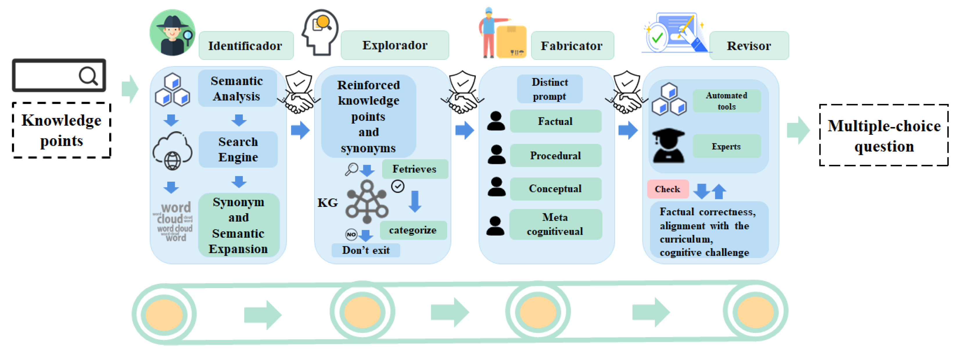 t. The Fabricator’s innovation is reflected in its ability to dynamically adjust question complexity according to learning objectives. This agent adopts specific generation strategies (