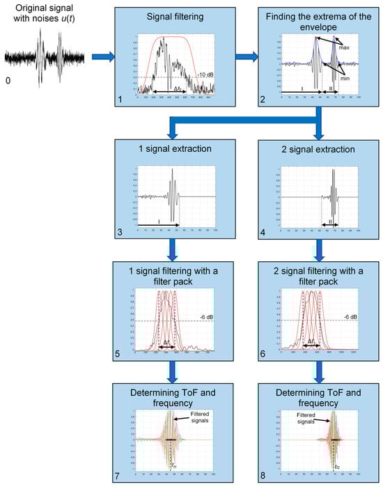 Finally, the ToF of the separated signals tf1 (Figure 1, (7)) and tf2 (Figure 1, (8)) are determined by averaging the times of the concentrated zero-crossings instances