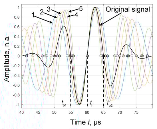 Figure 2 shows the original signal (black line) and the signals filtered by a five-filter package (No. 1–5, color line). The zero-crossings are marked in these signals. The concentration of zero-crossings is clearly visible. It corresponds to the ToF (tf) of the signal. The five-filter package was chosen based on the studies conducted in [23] because, as the number of filters increases, the uncertainties in determining the zero-crossing concentrations begin to increase.
