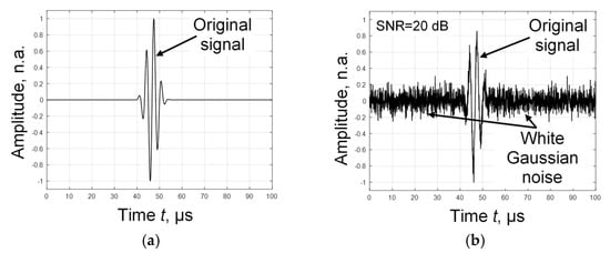 300 kHz original signal (a) and the same signal with white Gaussian noise (signal-to-noise ratio SNR = 20 dB) (b).