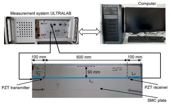 The simplest guided wave propagation experiment was performed on a 0.8 × 0.45 m2 sheet molding compound (SMC) plate with a thickness of d = 2.3 mm (Figure 4). The ultrasound system “ULTRALAB”, developed at the Ultrasound Research Institute of Kaunas University of Technology, was used in the experiment. In the SMC plate, the S0 mode of guided waves was generated by PZT contact transducers excited at a resonant frequency fex = 180 kHz. The received signal was also recorded by a PZT transducer at a distance of L1 = 600 mm. A 65 V, 3-period sine signal with a Gaussian envelope was used to excite the transmitter.