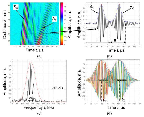 (a) The B-scan of the measured amplitudes of the Lamb wave signals in the PVC film of the thickness d = 200 µm. (b) The signal recorded at a distance of 60 mm from the transmitter and the envelope of this signal with the determined maxima and minima. (c) Signal and filter frequency response. (d) Signals filtered by a filter package, and zero-crossings fixed in these signals.