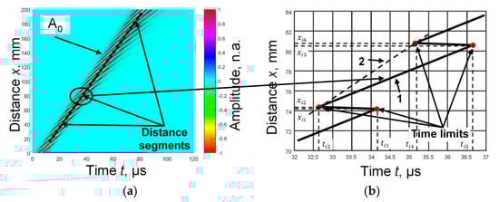 One more case of using the proposed method was to calculate the phase and group propagation velocities of the A0 mode using the algorithm for determining the propagation time values (ToF) of the ultrasonic signals in the B-scan. The methodology of phase and group velocities estimation is described in detail [23]. We used a typical simulated B-scan image (color coded) (Figure 8a) where the signals propagated in an aluminum plate with a thickness of d = 1 mm, and the excitation frequency of the transmitter was 300 kHz. In the presented B-scan image, together with the simulated signals, the ToF values (line) are plotted (Figure 8a).