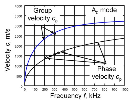 Using the ToF calculation methodology and the group and phase velocity estimation method, the segments of the A0 mode dispersion curve of isotropic materials were calculated [23]. The values of these segments were compared with the theoretical dispersion curves of the A0 mode, calculated by the one-dimensional SAFE method (Figure 9).