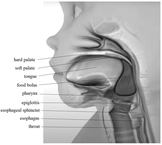 Dysphagia concerns various activities associated with eating, including difficulties in oral intake of food, or liquids, forming a bolus (a bool-like food bite), or swallowing (Figure 1) [12,13]. It may manifest as a singular symptom or as one of a collection. Some kinds of feeding problems occur in about 25–45% of children, and in children with developmental delays, this percentage reaches as much as 80% [14,15]. This mainly affects children with neurological disorders of the functioning of the muscles responsible for swallowing. Dysphagia is also common in children with anatomical abnormalities, such as cleft palate, laryngeal deformities, or esophageal atresia, or genetic conditions such as Down syndrome [8,11,12,16]. Another case is that of neurological problems, e.g., disorders of the function of the orofacial muscles involved in, among others, the oral–facial complex taking part in feeding and its transfer to the esophagus, as well as cerebral palsy or brain injuries [7,17]. Dysphagia may also be attributed to disorders of the digestive system, such as gastroesophageal reflux, and may also be associated with posture and movement control issues [2,3,18]. Children with dysphagia resulting from neurological disorders exhibit an elevated frequency of upper respiratory tract infections, thereby increasing the likelihood of recurrent pneumonia [8,19].