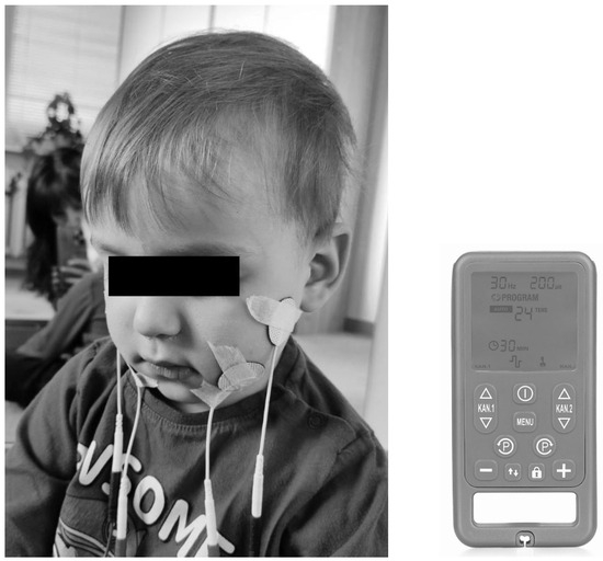 Traditional treatments of dysphagia usually consist of physical exercises of the orofacial muscles and a diet modification to suit the child’s abilities [22,24]. These methods do not always bring the desired results, which prompts researchers to search for new therapeutic solutions. One of the promising methods supporting dysphagia therapy is neuromuscular electrical stimulation (NMES), which uses low-frequency currents for transcutaneous muscle stimulation [21,25]. In dysphagia therapy, this technique involves stimulating the muscles that control the swallowing process.