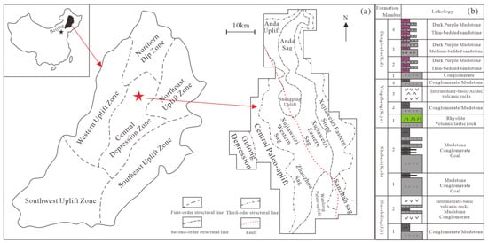 (a) Location of the Xujiaweizi Fault Depression; (b) comprehensive stratigraphic column of the deep strata in the Xujiaweizi Fault Depression.
