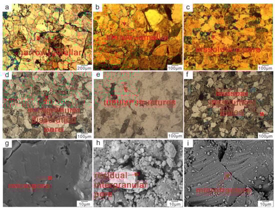 Pore and throat microscopic features of the Denglouku Formation reservoir in the Xujiaweizi area: (a) Narrow lamellar, S3, 2914.7 m; (b) Narrow lamellar, S1, 2889.8 m; (c) Dissolution pore, S13, 2725.3 m; (d) Intragranular dissolution pore, S12, 2695 m; (e) Tubular structures, S5, 3075.3 m; (f) Feldspar dissolution pores, S15, 3055.5 m; (g) Micropore, S11, 2898.6 m; (h) Residual intergranular pore, S2, 2860.6 m; (i) Microfracture, S8, 3148.4 m.