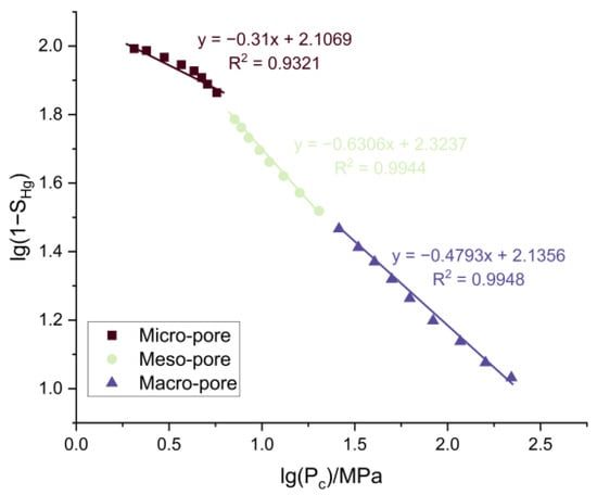 Based on capillary pressure experimental data, the relationship between lg(S) and lg(Pc) can be determined. In this experiment, air serves as the wetting phase, while mercury acts as the non-wetting phase. Therefore, lg(S) is converted to lg(1 − SHg), where SHg is the mercury saturation. Then, the slope of the relationship trend line of lg(1 − SHg) and lg(Pc) is analyzed, which represents the Hurst exponent H. Finally, the fractal dimension D is calculated as follows: