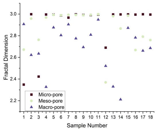 Fractal dimension distribution of micropores, mesopores, and macropores in the study area samples.