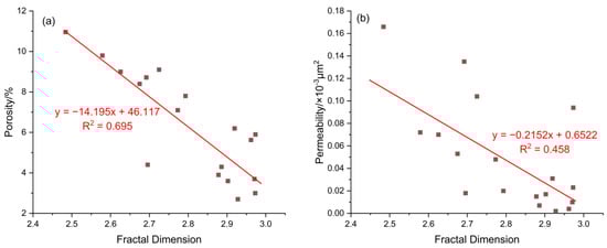 (a) The relationship between fractal dimension and porosity; (b) the relationship between fractal dimension and permeability.