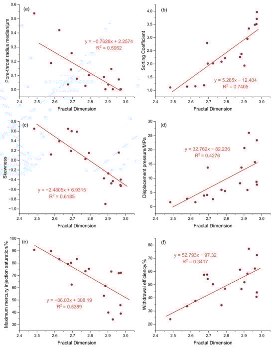 The relationship between fractal dimension and (a) Pore-throat radius median; (b) Sorting Coefficient; (c) Skewness; (d) Displacement pressure; (e) Maximum mercury injection satu-ration; (f) Withdraw efficiency.
