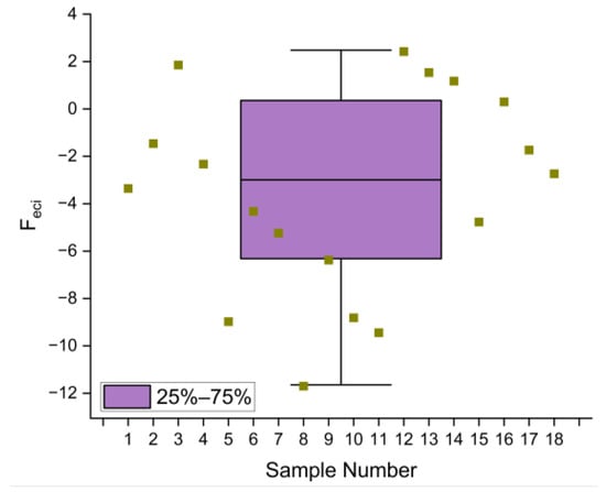 Scatter plot of the Feci index for each sample overlaid with box plot statistics.