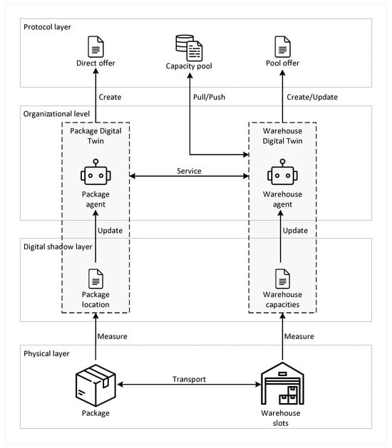 The decentralized warehousing system is built upon a multi-layered architecture, with each of the following first four layers playing a specific role in system operation: the physical layer, the digital shadow layer, the organizational layer, and the protocol layer. In combination, these layers provide the infrastructure and data flows that enable the system to function seamlessly, as illustrated in Figure 1. In this layered structure, package agents and warehouse agents play the central role, autonomously managing storage services by interacting with and leveraging information from the four layers. The subsequent sections provide a detailed description of each layer’s role and functionality, followed by an in-depth look at the agent design, which covers the states, decision-making processes, and interactions of the package and warehouse agents within this system.