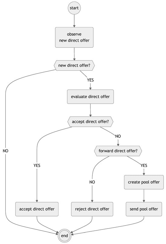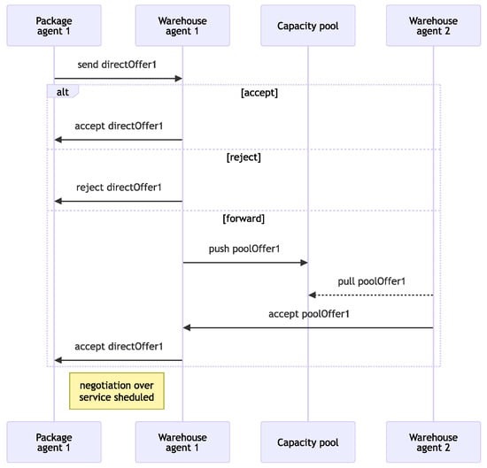 A direct offer is a data structure which is initiated by the package agent and sent to the warehouse agent as a formal proposal for service. The direct offer defines the terms under which the package agent requests a service and includes several essential parameters, as shown in Equation (27):