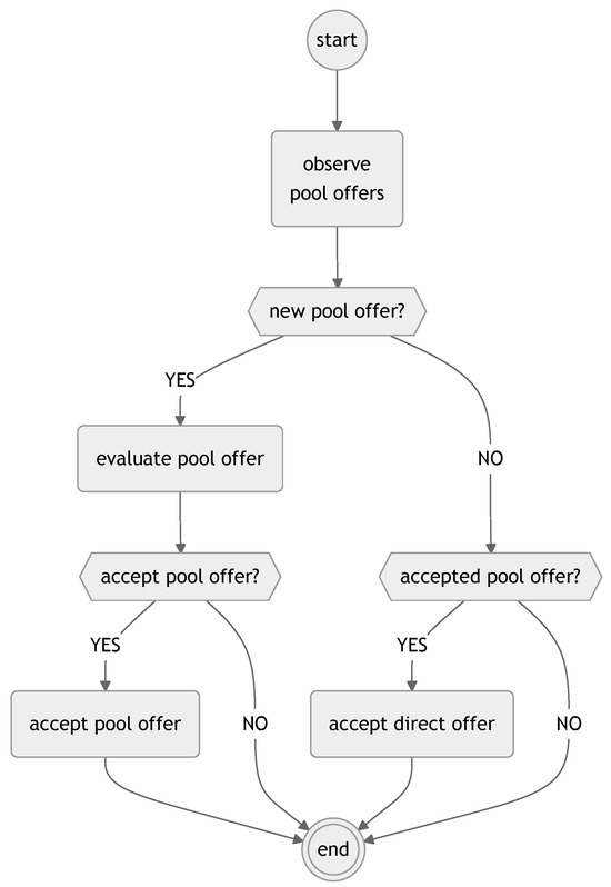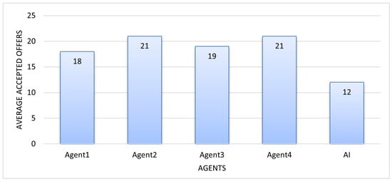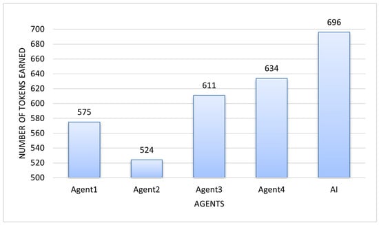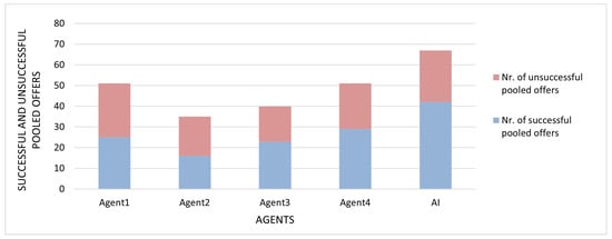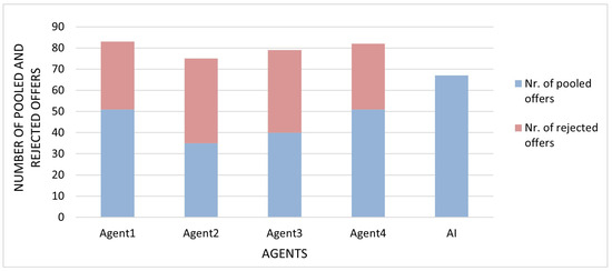 As shown in Figure 12, the AI submitted the highest number of offers to the pool and achieved the most successful submissions. Although it accepted fewer offers from the pool than other agents (Figure 13), it optimized the results through a higher token-per-offer ratio. These findings confirm that AI effectively adapts to complex environments by making context-sensitive, profit-optimized decisions.