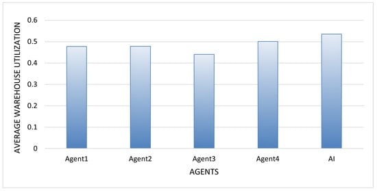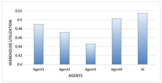 As described in the experimental setup, four simulation scenarios were implemented to evaluate the performance of the proposed shared storage system. Scenarios 1 and 2 varied warehouse capacities (one vs. five units), while Scenarios 3 and 4 introduced a capacity pooling mechanism, allowing agents to forward unaccepted offers. This structure enabled a systematic assessment of how warehouse size and pooling affect agent performance and resource utilization.