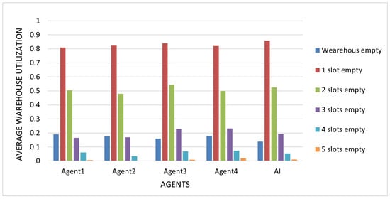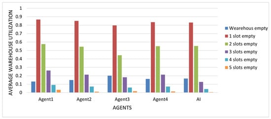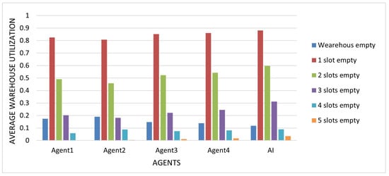 Once again, the AI recognized that the expected profit from submitting offers to the pool was consistently higher than from rejecting them. By understanding this ratio and the constant balance between successful and unsuccessful submissions, the AI achieved greater earnings than the other players. Interestingly, even in its worst game, the AI still managed to achieve the highest number of tokens per accepted offer, which was 3.9, in comparison with the others, who achieved 3.7 and 3.4. The lower performance in this game was due to the limited number of accepted offers and consequent poorer storage utilization (Figure 15), as evidenced by the suboptimal utilization of the later storage slots. The AI had almost half the capacity filled in its third storage slot compared to other players, which also held true for the fourth and fifth storage slots in this game.