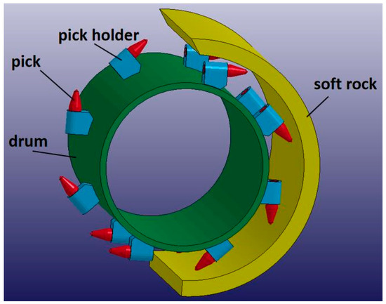 The cutter consists of a cemented carbide-tipped head and a tool base. The head is brazed to the tool base. As these two components are brazed together, they are also integrated into the model. By defining the picks, pick holder, and drum as rigid materials, the model can be simplified. This saves computation time and has minimal impact on the results. The model uses an eight-node SOLID164 unit and a default constant stress unit formula to define the type of contact between the tool and the soft rock (erosive contact).
