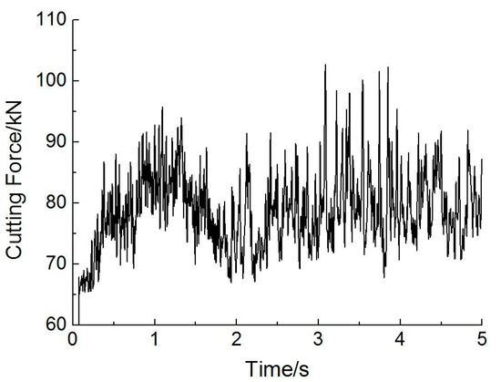 The cutting force of the cutting head during rock breaking is shown in Figure 4. It can be seen that the cutting force fluctuates macroscopically during the cutting process because the number of picks acting on the rock is different at different time periods. At 1 s or so, there were six picks cutting the rock at the same time, so the load was relatively large. Only four picks were simultaneously cutting the rock at about 2 s, so the load was relatively small. As the cutting head is subject to vibration because of microscopic fluctuations in the cutting force, a further analysis regarding the fatigue strength of the pick, pick holder, and drum is needed.
