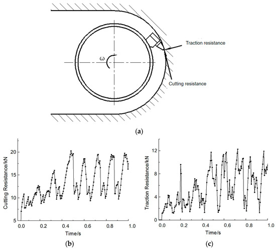 Variation in the cutting force of the cutting head over time with regard to (a) the force diagram, (b) the cutting resistance and (c) traction resistance.