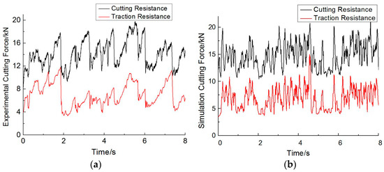 Comparison of the cutting force curves for the experiment and the simulated model: (a) cutting resistance and (b) traction resistance.