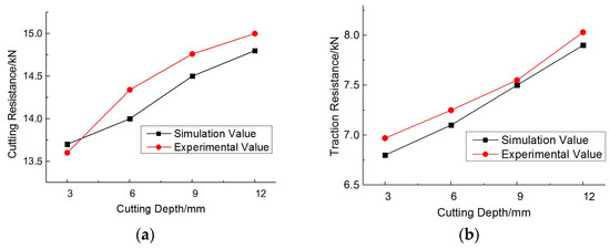 The cutting force curves, according to different cutting depths for the physical experiment and the simulation, are shown in Figure 8, respectively. By comparing the two, it can be seen that both cutting force curves have a step change and maintain much the same amplitude, as shown in Figure 9. On top of this, it can be seen from Figure 9 that the average values for the cutting resistance and traction resistance display the same trends. Thus, the simulation results are consistent with the experimental ones. The maximum error between the two sets of results occurred when the cutting depth was 6 mm. At this point, the cutting resistance values for the physical experiment and the simulation were 14.5 kN and 13.9 kN, respectively. However, this difference is still less than 5%. Therefore, the experiment proved the effectiveness of the approach to simulation and the accuracy of the simulated model, allowing for a minimal error tolerance.