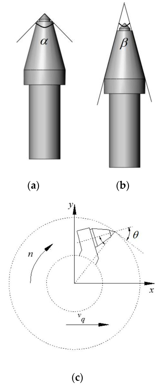 - Liu, S.Y. Method to determine installing angle of conical point attack pick. J. Cent. South Univ. 2012, 18, 1994–2000. [Google Scholar] [CrossRef]