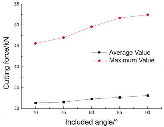 The curve for changes in the cutting force relating to the pick’s included angle, based on the above simulation parameters, is shown in Figure 11. It can be seen that as the pick’s included angle increased, the cutting force also increased. This is because the larger the included angle, the greater the contact area between the tool and the rock, resulting in less pressure on the rock per unit area. Therefore, a bigger cutting force is needed to break the rock. However, the pick strength decreases with any decrease in the included angle, so there is a trade-off between the tool strength and minimizing the included angle. The fluctuation coefficient affects the fatigue wear of the pick, so that a smaller fluctuation coefficient can reduce the fatigue wear. Figure 12 shows that when the pick’s included angle was 75°, the fluctuation coefficient of the tool was at its minimum. At the same time, the specific energy consumption of the pick increases as the included angle increases. Taking the cutting force, fatigue wear, and fluctuation coefficient into consideration, the included angle of the pick should be in the range of 70° to 75°.