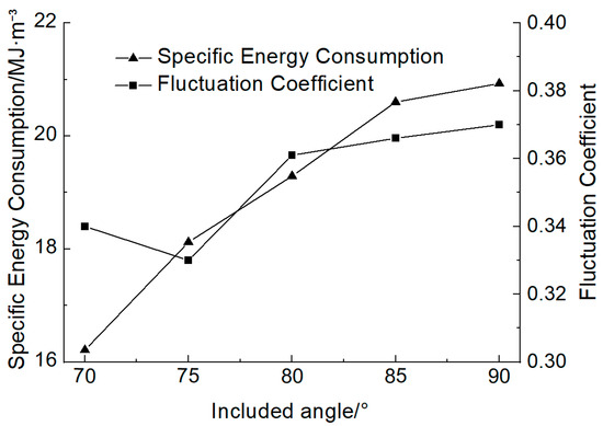 Differences in the pick’s specific energy consumption and fluctuation coefficient according to the included angle.