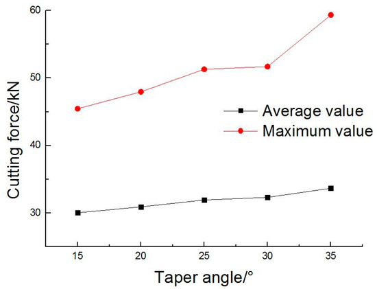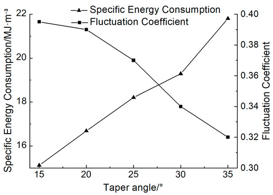 The simulation parameters from Table 2 can be used to obtain the curve for the changes in cutting force according to the different pick taper angles, as shown in Figure 13. It can be seen that as the taper angle increases, the average and maximum value of the cutting force increases, but the fluctuation coefficient decreases. Thus, increases in the taper angle have a negative effect upon the cutter being able to break into the rock, but help to increase the stability of the process. Figure 14 shows the changes in the specific energy consumption and fluctuation coefficient according to the taper angle. Both the cutting force and fluctuation coefficient need to be carefully considered for tool design. On the basis of these two factors, the taper angle of the pick needs to be in the range of 25° to 30°.