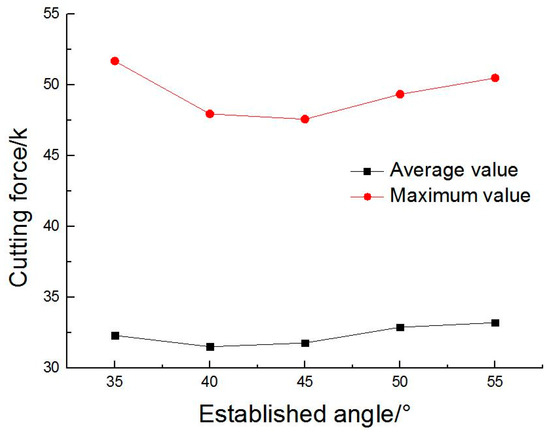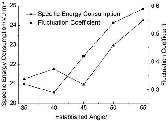 By using the simulation parameters from Table 2, the curve representing the changes in the cutting force according to the established angle can be obtained, as shown in Figure 15. In this case, as the established angle increases, the cutting force initially decreases, then increases, with the minimum value remaining between 40° and 45°. This is because the larger the established angle, the greater the angle between the cutter axis and the rock, which hinders the cutter from breaking into the rock. At the same time, the smaller the established angle, the bigger the contact area between the flank and the rock, leading to more friction. As shown in Figure 16, when the established angle reaches 45°, the pick has the lowest specific energy consumption, and when the established angle is 40°, the fluctuation coefficient reaches its minimum. It can be deduced from this that the optimal value of the established angle will fall within the range of 40° to 45°.