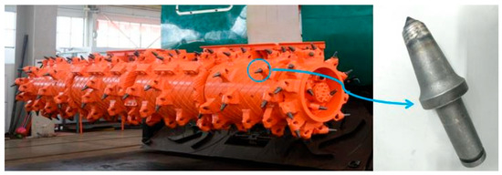 As shown in Figure 17, the structural parameters of the pick equipped with the tunneling–bolting combined machines are the included angle of 75°, the taper angle of 25°, and the established angle of 45°. At present, the tunneling–bolting combined machines have been operating in a certain coal mine in China. During the tunneling process, the cutting head uses a 1 m cycle, the advancing speed can be adjusted for the whole load, and the actual operating speed of the machinery does not exceed 8 m/min. The monthly advancement reaches 3600 m. The machinery operates well, and its crushing capability is good. The results indicate that the finite element models based on the double-failure criterion can effectively predict the cutting head performance and provide a sound theoretical basis for the optimal design of the cutting head.