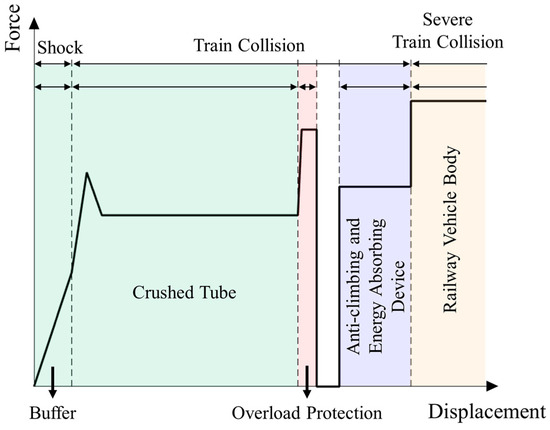 The orderly and controllable energy absorption of the coupler buffer device can effectively reduce casualties in train collision accidents. The role of the overload protection device is to promptly disconnect the coupler from the vehicle body, allowing subsequent anti-climbing energy absorption devices to come into contact and absorb energy. In the collision accidents, Figure 1 indicates that the impact kinetic energy is absorbed in the following order: shock absorbers, crushed tube, anti-climbing energy absorbers, and the train body [1,2,3,4]. The purpose of the overload protection device is to disconnect the coupler (which includes the shock absorber and crushed tube) from the train body after the crushed tube has completed its energy absorption, allowing the coupler to freely retract. Otherwise, the long, slender structure of the coupler can act like a lever, lifting the train and potentially causing climbing between vehicles or derailment [5,6,7]. Additionally, if the coupler cannot retract freely, the high-strength coupler can impede the contact of the train’s anti-climbing energy absorption device, interfering with the normal operation of the collision energy management system [8,9].