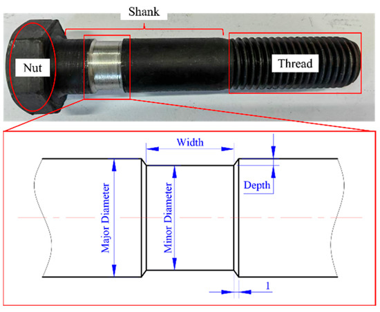 There are many factors that affect the axial impact resistance performance of bolts, in addition to basic material and diameter; studies have shown that the impact resistance performance of bolts is also related to the bolt preload and the length of the connecting threads [22,23,24]. The tensile failure of bolts mainly includes two forms: thread failure and bolt shank failure [16,25]. When the bolt experiences thread failure, its breaking force value will be much lower than the force required to break the smooth shank of the bolt, which is contradictory to the need for a controllable and stable breaking force value in overload protection devices. In the study of the dynamic mechanical properties of thin-walled structures, controlling deformation through inducing structures has been proven to be reliable [26,27,28]. Based on this design concept, cut-out induced bolts have emerged. These bolts weaken the strength of the cut-out zone by setting a cut-out zone on the smooth shank of the bolt, allowing tensile failure to occur at this location and providing better control over the breaking force value. Yao et al. [29] studied the effect of preload on the cut-out induced bolt. The results showed that excessive preload force could cause deformation of the cut-out zone, thereby affecting the breaking force value of the bolt. It can be seen that reasonable cut-out zone structural parameters are an effective means to improve the stability of the fracture mode of the cut-out induced bolts and the reliability of the overload protection function.