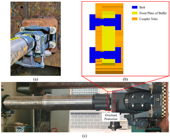 The installation of overload protection: (a) overload protection in coupler; (b) cross-sectional view of overload protection; (c) installation diagram in experiment.
