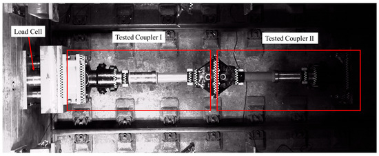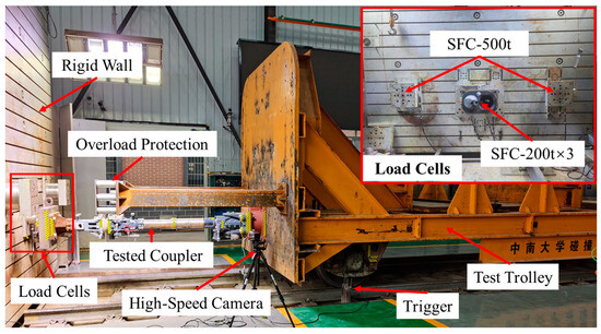 Figure 4 shows the collision test bench at Central South University used for this experiment. The test bench includes a fixed end, a moving end, and data acquisition equipment. The main part of the moving end is the test trolley, which is adjusted by placing weights on it to regulate the trolley’s mass. The tested coupler is placed at the center of the front of the bench, and experimental overload protection devices consisting of nine energy-absorbing tubes are installed on both sides. Unlike the coupler’s overload protection device, the experimental overload protection device is designed to protect the experimental equipment in case of accidents. The main part of the fixed end is the rigid wall, where three load cells are installed at the corresponding positions of the tested coupler and the experimental overload protection devices. The load cells mainly consist of coupling devices and force sensors. The force sensor components used in the test included two models, SFC-500t and SFC-200t, manufactured by the Beijing Great Wall Institute of Measurement and Testing Technology (Beijing, China). Their maximum measurement ranges were 0–5000 kN and 0–2000 kN, respectively, with measurement errors not exceeding 0.3%. The data acquisition equipment included a high-speed camera and speed sensor. The high-speed camera model used was MEMRECAM HX-6E, manufactured by the NAC Image Technology (Tokyo, Japan), with a maximum resolution of 2560 × 1920 pixels. It offered six shooting speed options: 100 fps, 300 fps, 500 fps, 1000 fps, 3000 fps, and 5000 fps, with a speed accuracy of ±0.01%. In the test, the shooting speed was uniformly set at 3000 fps. The speed sensor (Model TD400C) was manufactured by the SIMENS (Munich, German), with a measurement error not exceeding 0.5%. The high-speed camera was set up above and to the left of the track, while the speed sensor was located at the center of the track to record the speed of the bench before it impacted the rigid wall. Both were triggered by a trigger on the side of the track. According to the energy absorption parameters of the tested coupler, the mass of the test trolley for this experiment was 29 t.
