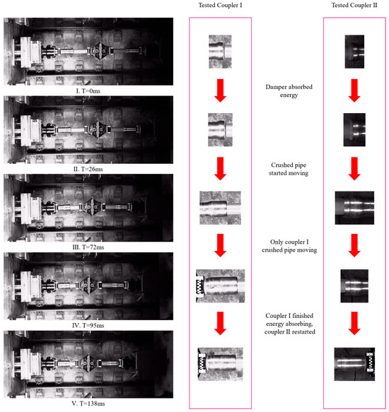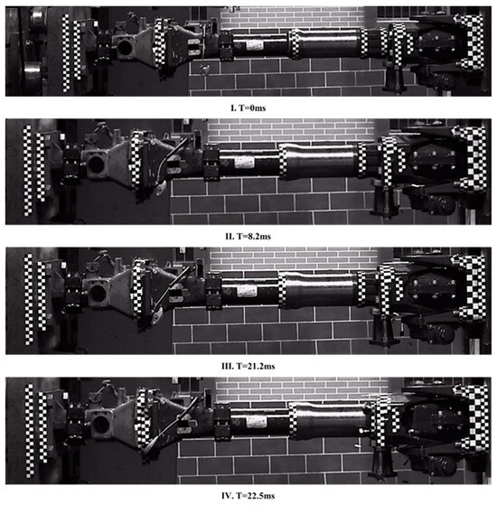 According to the data transmitted back by the speed sensor, the speed of the test bench when it impacted the rigid wall was 7.504 m/s. The high-speed photography camera recorded the displacement–time image of the coupler collision process, as shown in Figure 5. Combining the high-speed photography images with the force–time curve, T = 0 ms when the couplers were in contact according to the high-speed photography, at which point the contact force between the couplers was zero. When T = 8.2 ms, the expansion tubes began to crush, and the contact force between the couplers fluctuated around 1200 kN. When T = 21.2 ms, the contact force between the couplers was about to rapidly drop to zero, so it was judged that the bolts break at this time. When T = 24 ms, the broken bolts can be clearly observed flying out from the high-speed photography images. When T = 40 ms, the couplers completely retracted and separated from the rigid wall, and the overload protection devices on both sides were in contact with the rigid wall.